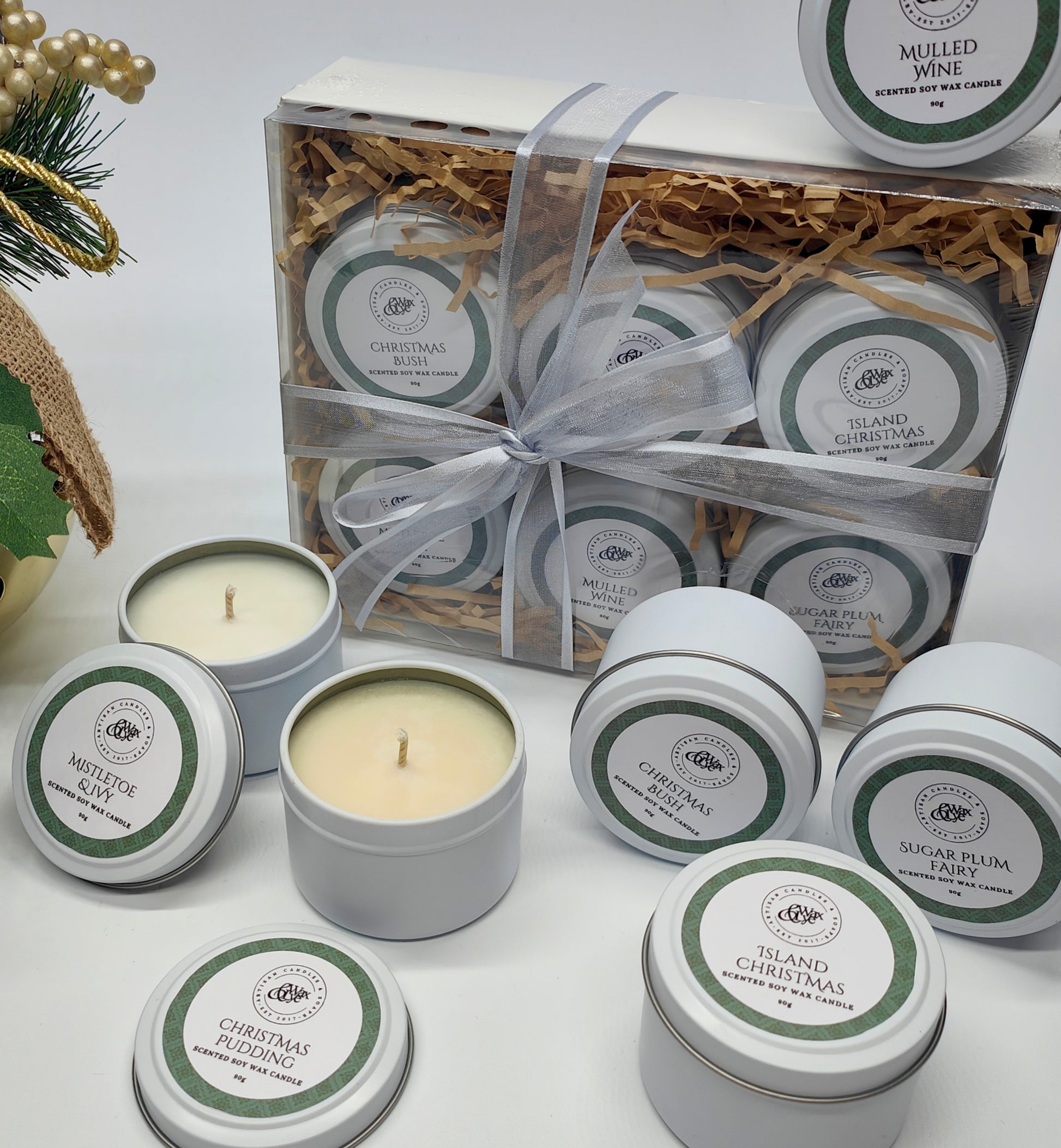 Bring the spirit of the season to life with our Christmas Candle Gift Box, featuring six beautifully hand-poured soy candles in signature holiday fragrances. From the nostalgic sweetness of Christmas Pudding to the fresh coastal charm of Island Christmas, each tin captures a different side of the festive season.